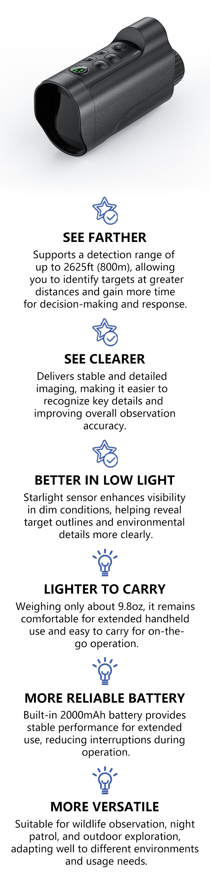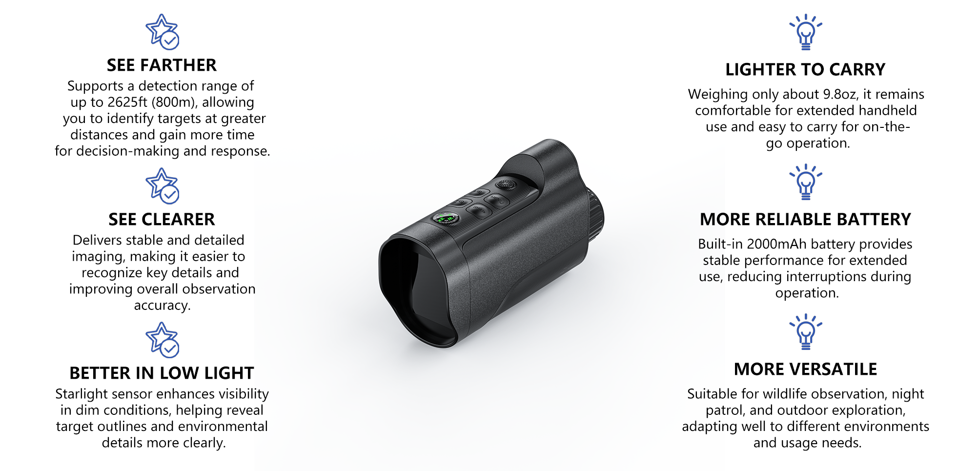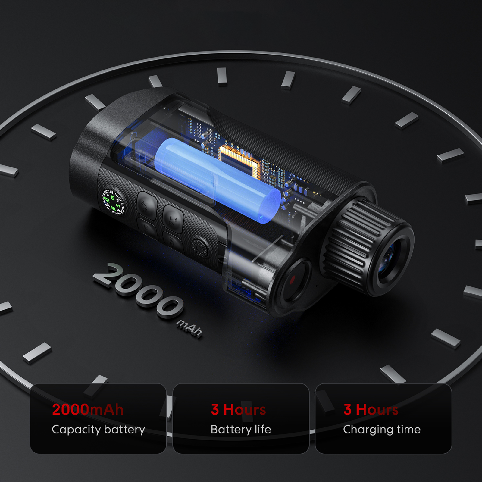 The built-in 2000mAh battery supports extended use, meeting typical observation and patrol needs.